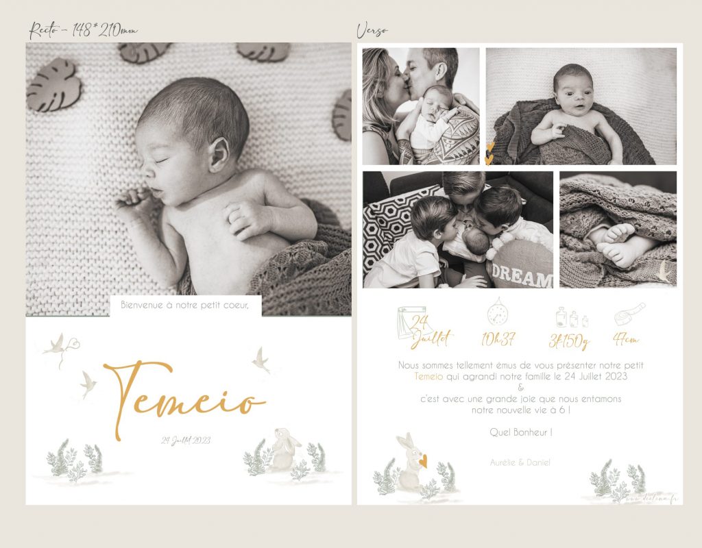 Je peux réaliser pour vous le design de votre faire part de naissance, gérer l’impression, l’achat des enveloppes et la commande de timbres personnalisés.