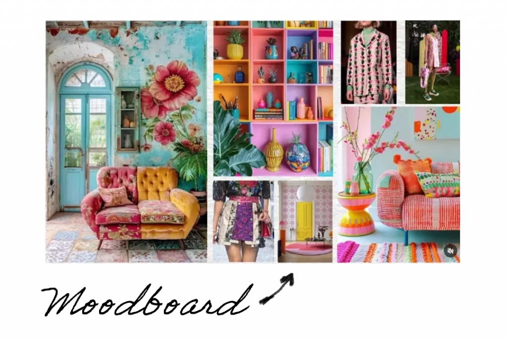 Le moondboard décrit un univers frais, coloré, graphique, avec une touche fleurie. Un mélange de baroque, seventies très créatif. A la fois Elégant et original. Le style doit être pétillant, avec des rappels de la mode chic & émotionnelle. Un style signature: jouer sur les textures, l’association des couleurs, des motifs au service du message véhiculé.